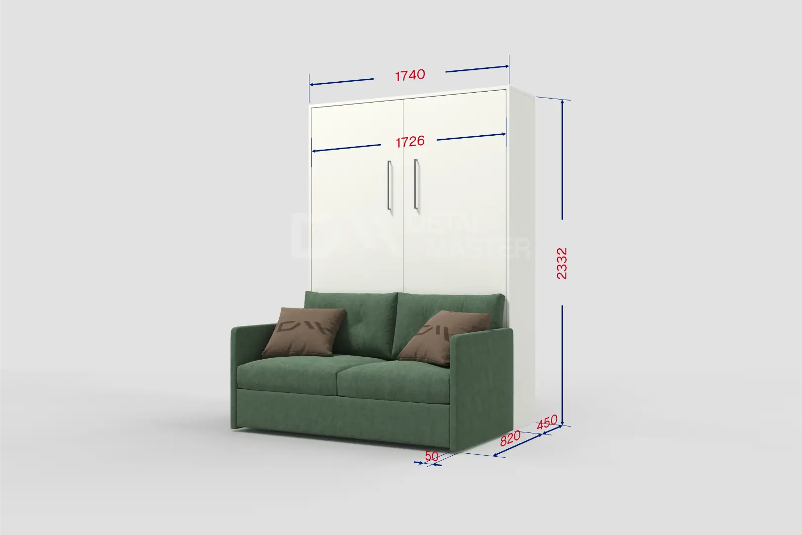 Шкаф-кровать "Simple Start Sofa" работает на механизме раскладывания собственной разработки "Start". Кровать раскладывается легким движением руки, превращаясь в полноценное спальное место. Просто потяните ее за ручки, расположенные на фасаде и выставите ножки-опоры.